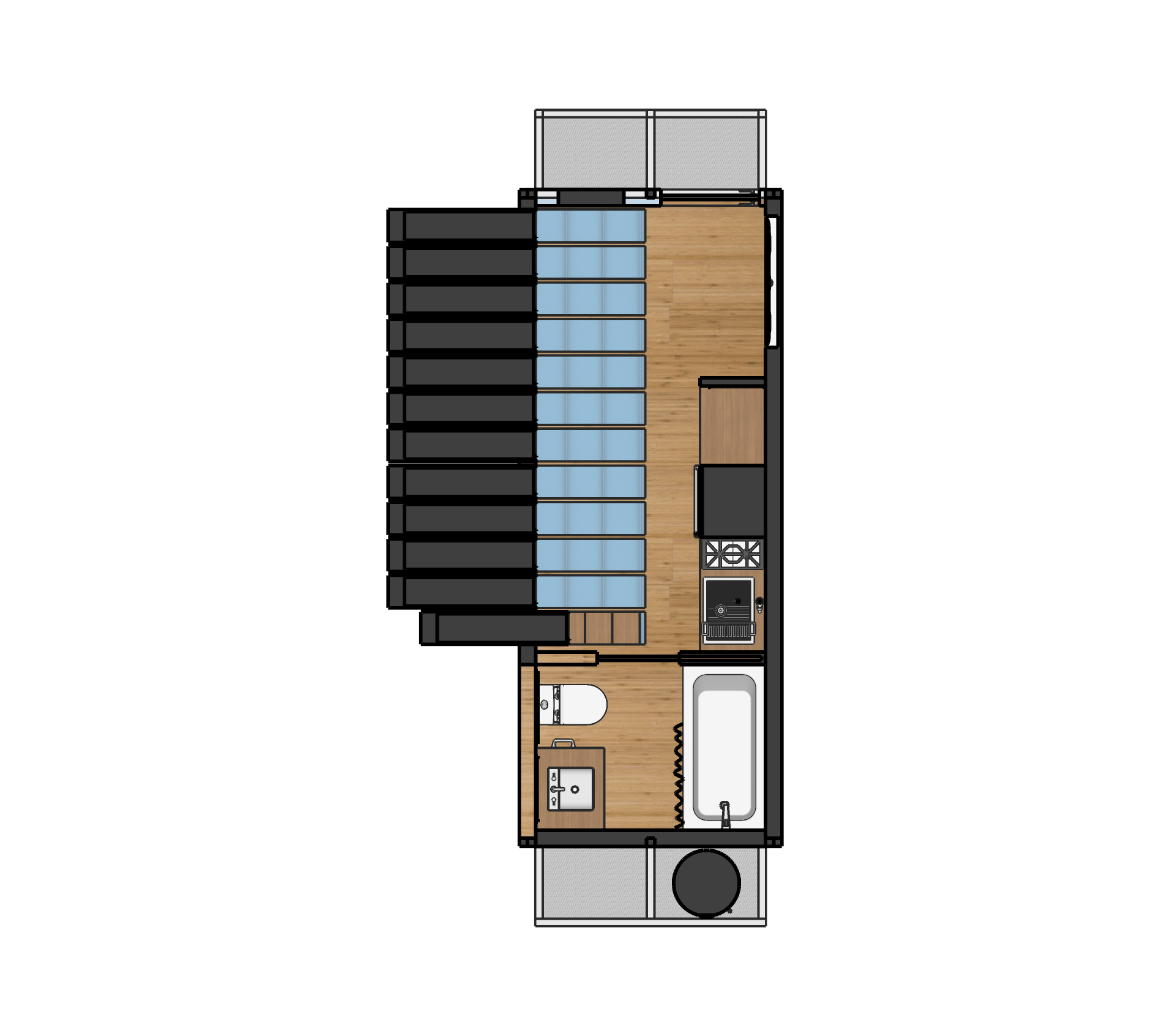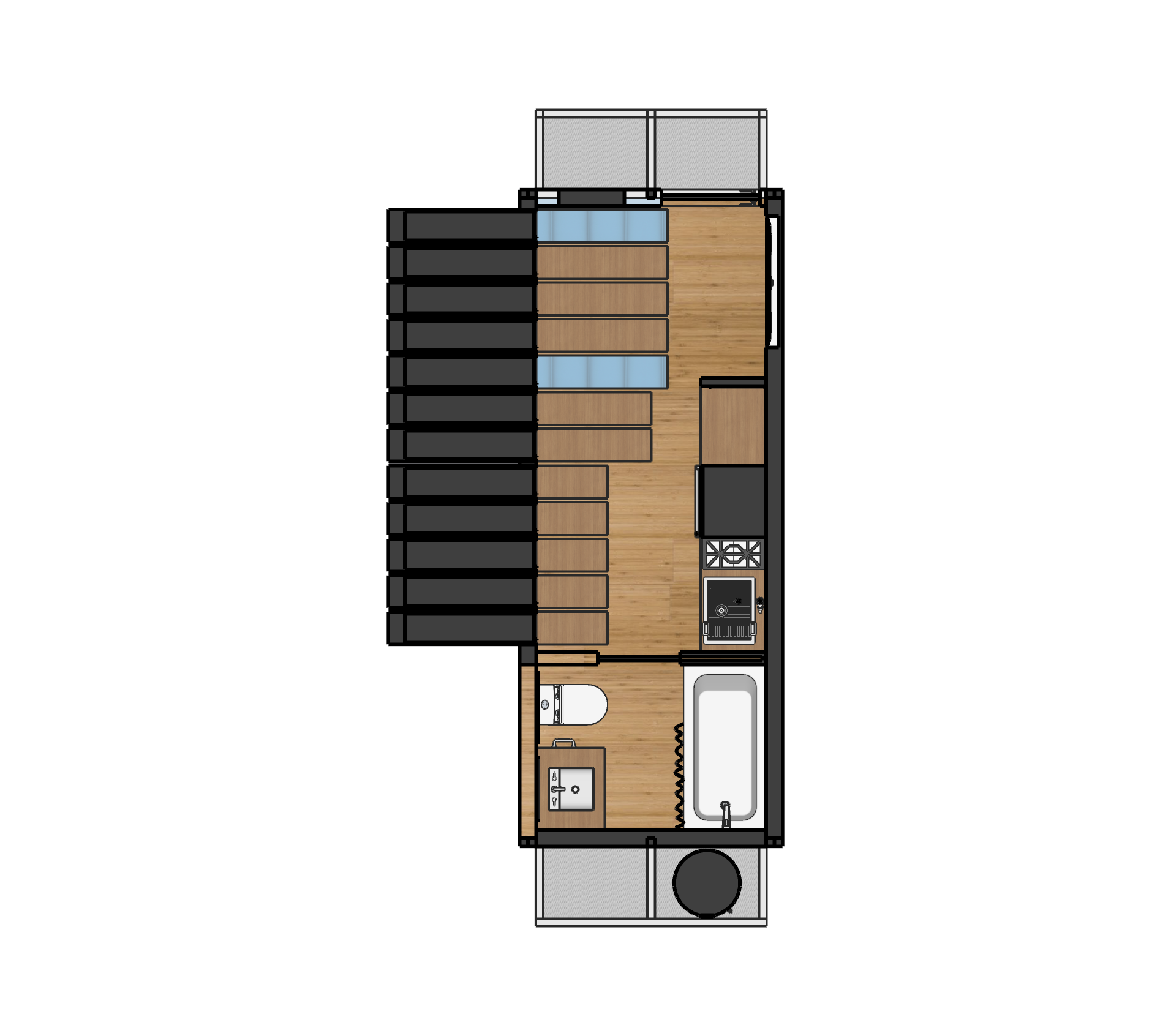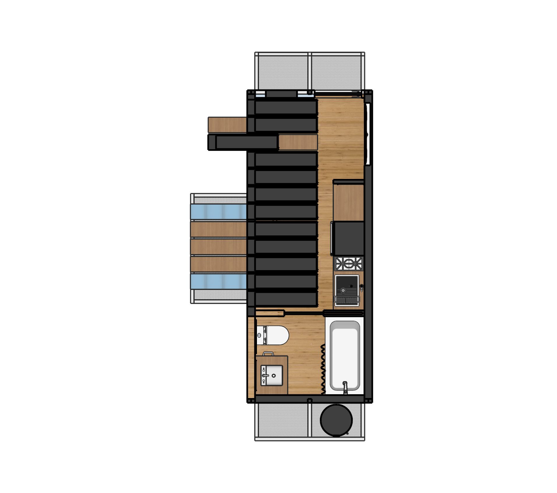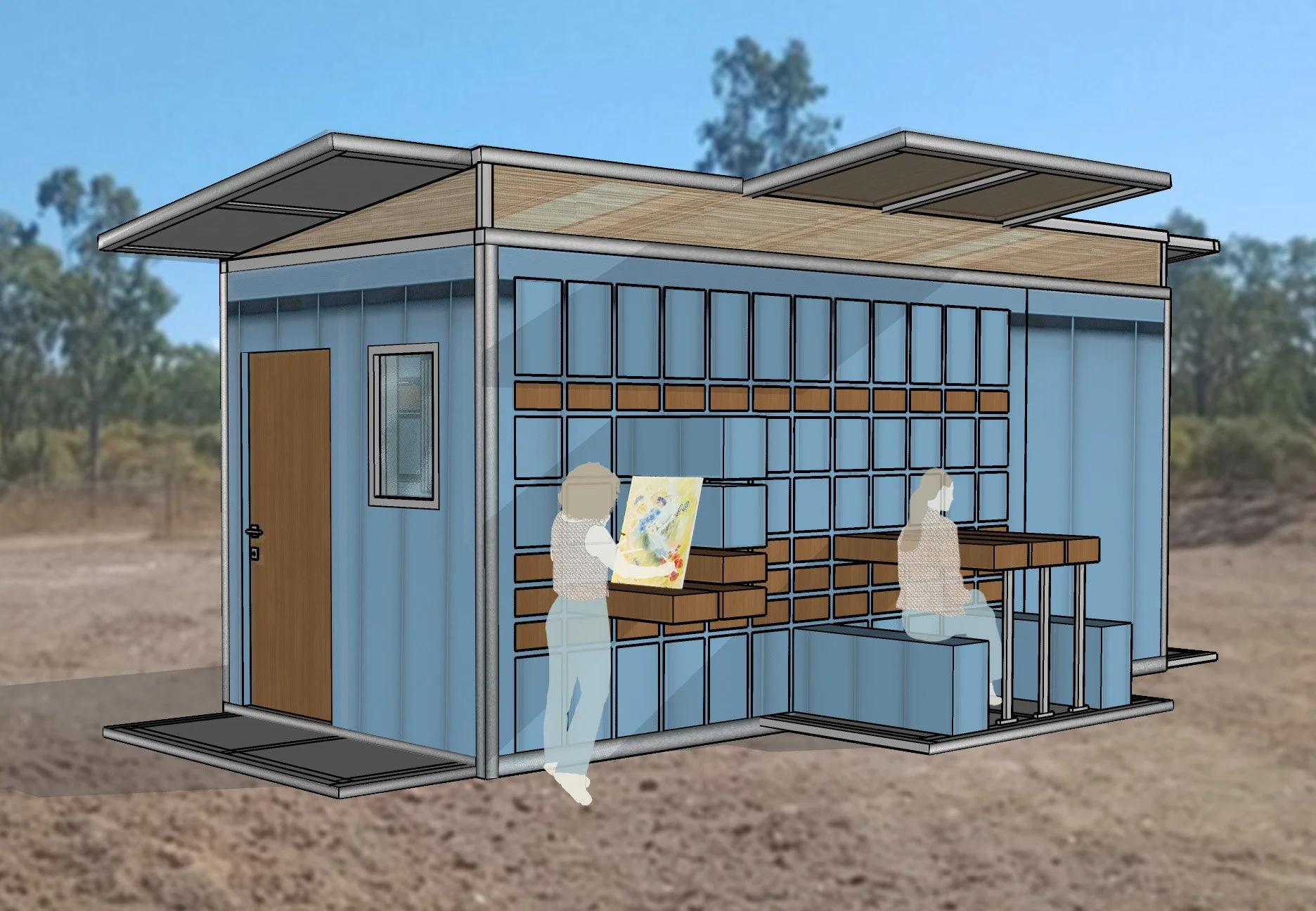 The final design introduces a reconfigurable wall system paired with strategic architectural updates, including relocated entry points, increased daylight, filtered ventilation, extendable platforms, and adjustable roof panels. Sliding exterior units activate the surrounding landscape, allowing residents to create work surfaces, seating, or shaded gathering areas.