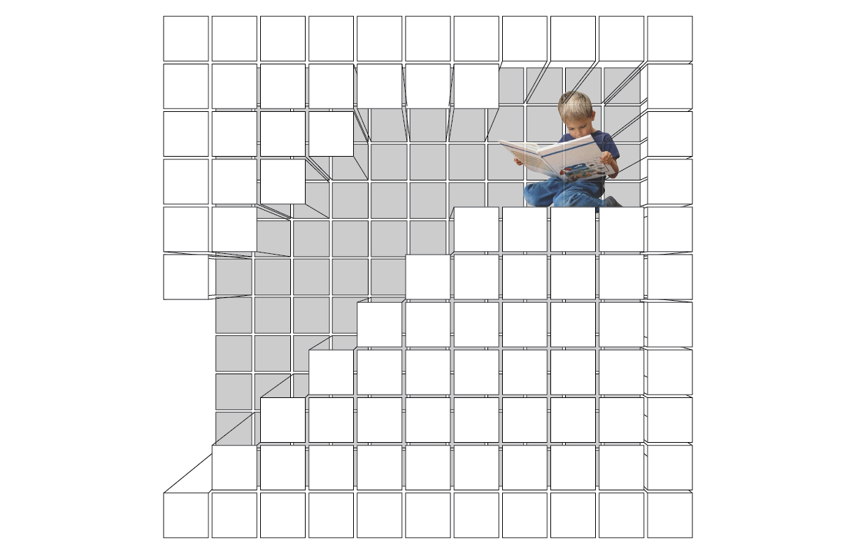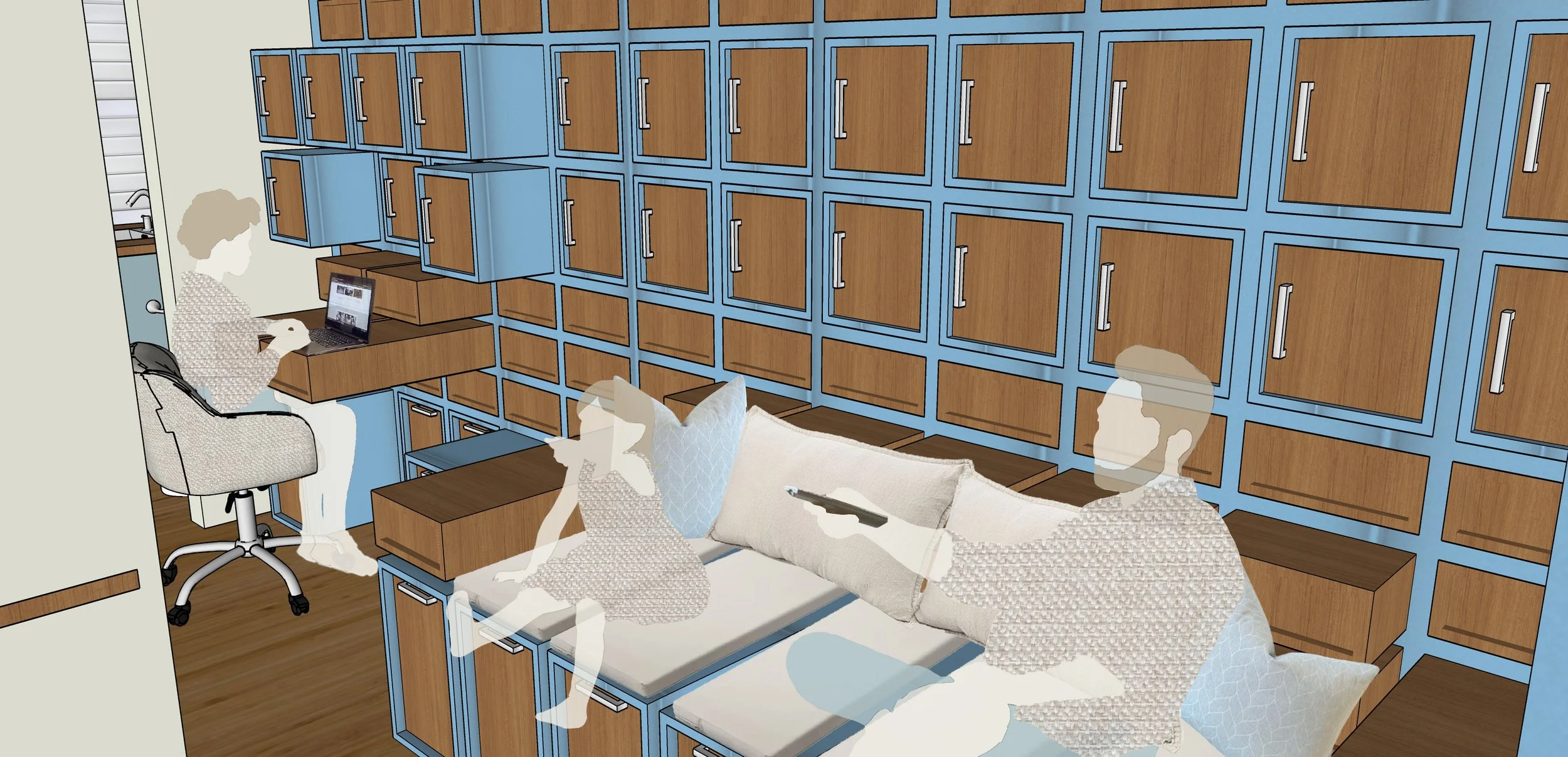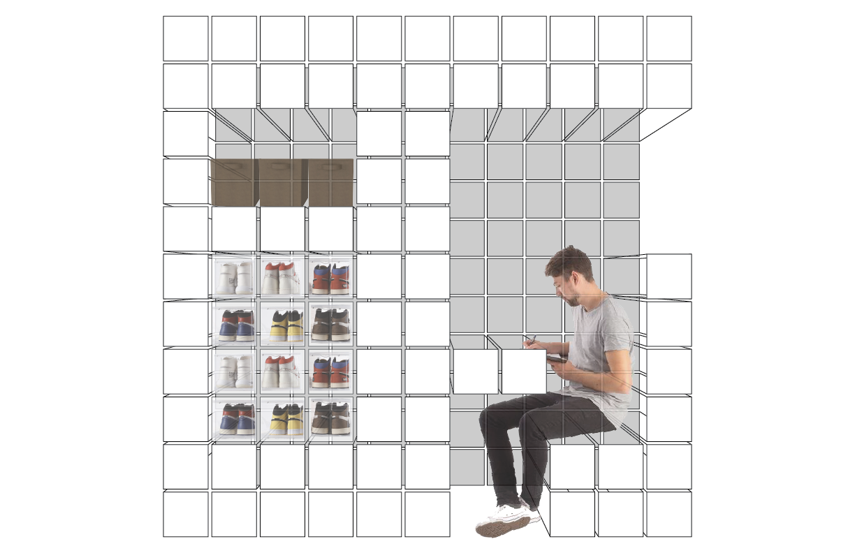 Early exploration focused on expandable systems that could adapt to shifting needs, using diagrams and physical models to test sliding and telescoping structures. Iterations moved toward orthogonal modular forms for efficiency, storage capacity, and constructibility. A grid-based system allowed components to transform into stairs, desks, closets, and seating, while maintaining a compact footprint.