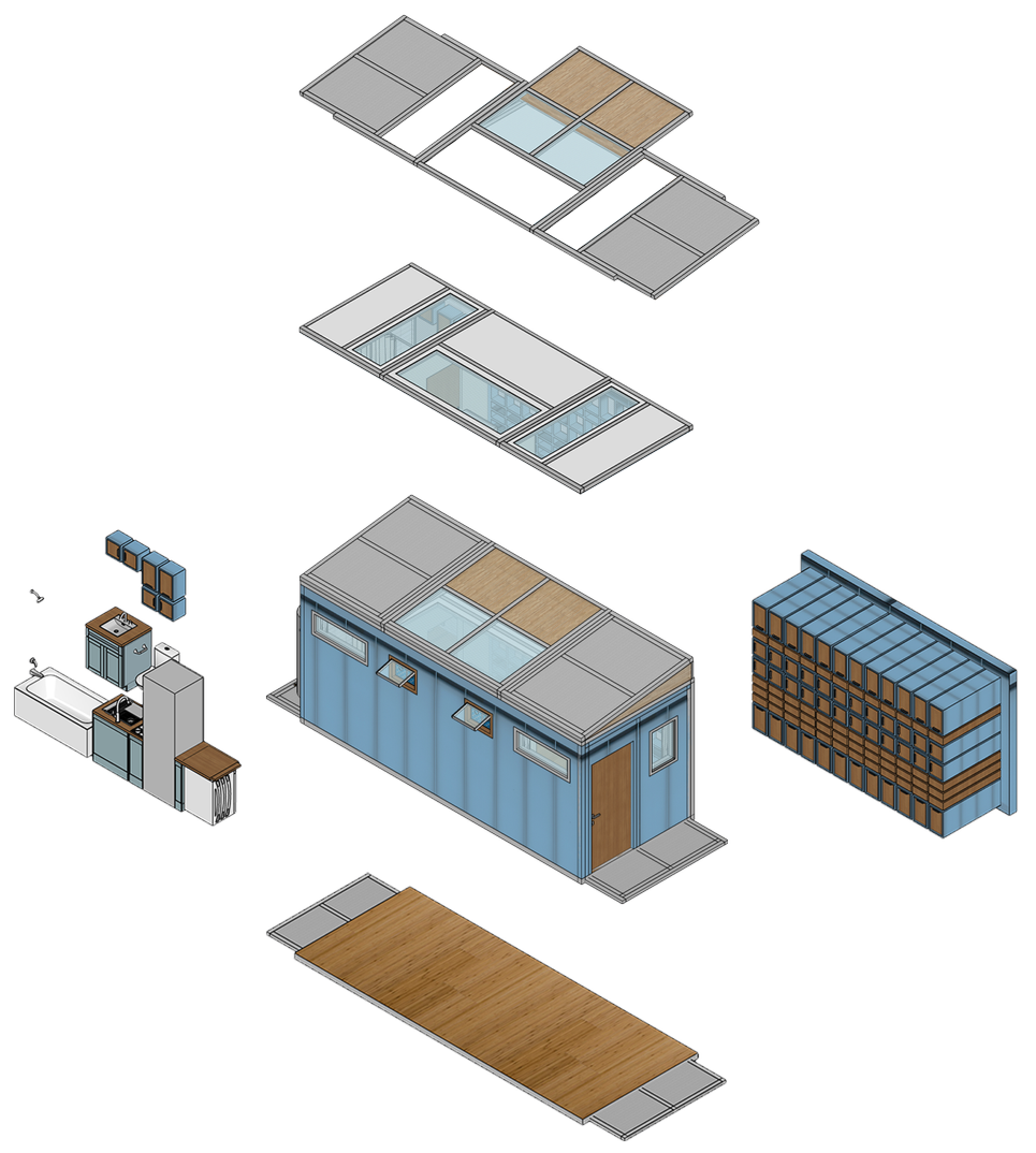 Material selections prioritize durability and climate response, using teak framing, bamboo flooring, and light blue metal cladding to deter insects and brighten the environment. The shelter expands and contracts as needed, offering adaptable storage, improved bathroom capacity, and multipurpose surfaces, transforming emergency housing into a more humane and resilient living environment.